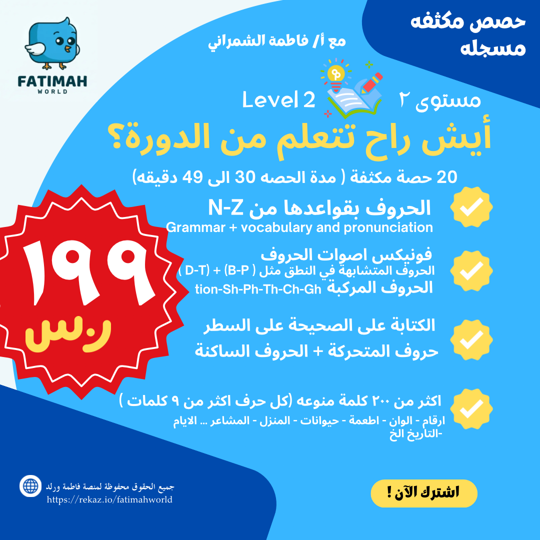 🔴 تعليم الطالب أن عدد حروف اللغة الإنجليزية 26 حرفاً، منهم خمس أحرف علة وهي (a- e- i- o- u) وهي حروف تؤثر في طريقة نطق الكلمات